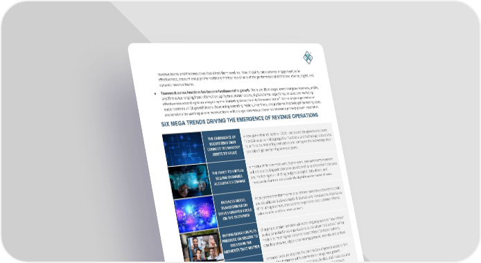 3 | ENABLING REVENUE OPERATIONS IN A 21 ST CENTURY COMMERCIAL MODEL COPYRIGHT © REVENUE ENABLEMENT INSTITUT E revenue teams and the executives that direct them need real time. Visibility into customer engagement, seller effectiveness, account and pipeline health are the four top drivers of the performance of distributed, diverse, digital, and dynamic revenue teams. • Teamwork across functions has become funda mental to growth . There are 18 strategic levers that grow revenues, profits, and firm value ranging from information agility to customer equity, digital channel experience, to sales and marketing effectiveness according to an analysis by the Marketing Acco untability Standards Board. 7 But no single organization or leader controls all 18 growth levers. Developing operating models, incentives, and platforms that help get marketing, sales, and service silos working as one revenue team with a single common purp ose has become a primary growth imperative. SIX MEGA TRENDS DRIVING THE EMERGENCE OF REVENUE OPERATIONS THE EMERGENCE OF ECOSYSTEMS THAT CONNECT TECHNOLOGY ASSETS TO VALUE A new generation of leaders - CXOs - will accelerate growth and create financial value by knitting together functional and technology ecosystems to unify sales, marketing and service and reimagine the technology stack to enable high - performing revenue teams . THE PIVOT TO VIRTUAL SELLING CHANNELS ACCELERATES CHANGE A massive shift to remote work, hybrid work, and work from anywhere will act as a tipping point for sales transformation and transform the sales and marketing mix – shifting budgets to digital, data - driven, and measurable channels and accelerate digital tran sformation of sales . BUSINESS MODEL TRANSFORMATION DRIVES GREATER FOCUS ON THE CUSTOMER As businesses transform some or all of their sales to a subscription, SaaS and cloud based business model it dramatically increases the importance of recurring revenues, the customer experience and customer lifetime value as a focus of the revenue team. BUYING BEHAVIOR PUTS PRESSURE ON SELLERS TO DELIVER IN THE MOMENTS THAT MATTER Changing customer behavior will reach a tipping point as “new school” buying behavior forces organizations to transform “old school” selling models to meet higher customer expe ctations for faster cadence, complete answers, digital channel engagement, and relevant content . GREATER ACCOUNTABILITY FOR FINANCIAL RETURNS ON COMMERCIAL ASSETS Increased pressure to prove the contribution of growth assets to firm financial performance will fundamentally change how growth resources/assets are allocated, organized, funded, and measured and focus technology strategies on improving returns on the growth technology stack . A REVOLUTION IN ADVANCED SALES ANALYTICS A revolution in analytics and AI - led innovation - fueled by rich new sales engagement data sources, increased investment, leadership focus, and the broader adoption of data - driven selling approaches will become the primary driver of value creation in sales a nd the key to increasing the return on selling assets in the next decade. Collectively, these forces have made the functional management of marketing, sales, support and fulfilment resources and the notion of a linear customer journey partitioned by function obsolete. Businesses that use functionally based organizational systems developed in the 20 th century to manage a far more advanced and digital commercial model in the 21 st Century will get sub optimal growth from their growth investments and commercial infrastructure. The financial consequences of this lack of alignment are significant and growing: