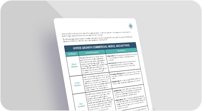 7 | Enabling Revenue Operations in a 21 st Century Commercial Model Copyright © Revenue Enablement Institute adoption or low levels of perceived value. These organizations are not able to sustain the net recurring revenue ratios requi red to justify the high valuations their investors and employees are counting on. The following page outlines typical commercial model archetypes for a hyper growth business, and the key aspects of the Revenue Operations model they need to focus on to take their growth to the next level. HYPER GROWTH COMMERCIAL MODEL ARCHETYPES Archetype Growth Dynamics Key Drivers Cloud Climber Fast growing cloud first businesses that are growing revenues at double digit rates by focusing on speed to market, optimizing the customer experience and scalable selling technologies and channels. The average SaaS business IPO grew at over 50% with net recurring revenue ratios over 100% and firm valuation of over 15 times revenue. 53 • Operations : Unifying commercial operations to leverage customer insights and scalable technologies across the enterprise. • Architecture: Reengineer roles and segmentation in commercial architecture to realize more market opportunity and focus resources on customer va lue. Leaky Buckets SaaS businesses that are able to acquire new customers at double digit rates but are unable to sustain net recurring revenue ratios of over 100% because their revenue teams are not aligned on the customer experience and there is significant revenue, opportunity, and margin leakage in the customer journey. • Common P urpose : Redefine incentives to focus revenue teams on customer lifetime value, retention, and account health. • Leadership: Put in place a single CXO (Chief Revenue Office ) to align commercial teams around the customer. Gas Guzzlers Pre - IPO cloud and SaaS businesses that are investing a significant percentage of their capital into generating hyper growth, preference and share but unable to achieve scalable and sustainable growth. Gas guzzler revenues are not growing enough to justify rising selling costs and seller performance is inconsistent due to unfocused territories, accounts, and very low returns on commercial selling assets. • Leadership: Create 100% accountability by defining financially valid criteria to prioritize, size, allocate and measure the performance of all commercial teams, budgets, operations, and enablement assets. • Operations: Map the cross functional customer journey to ident ify and eliminate the handoffs and “air gaps” in the prospect to cash cycle to revenue and margin leakage with a single point of management of the customer journey across the enterprise. Failure t o Launch SaaS businesses that are unable to generate the hi gh levels of organic growth and share of the total addressable market needed to generate valuations that justify capital invested and losses incurred because of inconsistency and failure to leverage scalable technologies in their commercial models. • Archite cture: Reengineer roles and segmentation, and coverage model to realize more market opportunity and focus resources on customer value. • Insights: Use predictive insights to significantly focus account priorities based on potential, propensity to buy and cov erage difficulty.