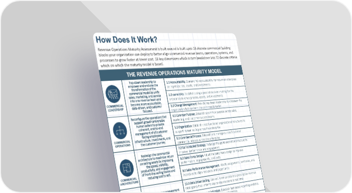 THE REVENUE OPERATIONS MATURITY MODEL Top - down leadership to empower and endorse the transformation of the commercial model to unify sales, marketing, and service into one revenue team and become more accountable, data - driven, and customer focused. 1.0 Accountability . Demand full accountability for return on enterprise selling resources, assets, and investments 2.0 ownership . Establish a single point of decision - making for the enterprise revenue process, assets, and investments 3.0 Change Management . Provide top down leadership to empower the organization to transform the commercial model Reconfigure the operations that support growth and enable human sellers to provide coherent, end - to - end management of all customer facing employees, infrastructure, investments, and the customer journey. 4.0 Common Purpose . Establish a common purpose across sales, marketing, and customer success teams 5.0 Organization . Establish cross functional organizational structures to support human selling across the enterprise 6.0 Commercial Process . Establish and manage a cross functional commercial process across the enterprise Redesign the commercial architecture to maximize return on selling assets by improving the speed, visibility, productivity, and engagement of front - line selling teams and reducing cost to sell. 7.0 Go To Market Strategy. Redesign the go - to - market architecture to improve performance and engagement 8.0 Sales Force Design. Adjust the sales force design to improve performance, engagements, and costs 9.0 Sales Performance Management . Modify assignments, territories, and incentives to align resources and opportunity Turning customer engagement and seller activity data into commercial insights that create value and inform decisions, actions, and conversations at the "moments that matter" in the human selling process. 10.0 Data Driven Selling . Convert revenue data into prescriptive revenue intelligence that informs day - to - day decisions in real time 11.0 Key Performance Indicators . Establish fact - based reporting analytics, KPIs and dashboards of commercial performance 12.0 Predictive Selling Insights. Use analytics to create better predictions, parameters, and scenarios to inform investment, allocation, and emphasis Building a common core of commercial capabilities that enable human selling and maximize the contribution of selling assets and investments to revenue and profit growth outcomes. 13.0 Enablement And Engagement. Reconfigure the commercial technology infrastructure to better support revenue team enablement 14.0 Readiness And Development. Reconfigure the commercial technology infrastructure to better support readiness, training, and development 15.0 Revenue Enhancement . Deploy technologies to enhance the lead - to - cash cycle and capture more revenue, margin, and price realization The strategic management of the commercial data, technology, content, and IP assets to maximize utilization, impact, and return on investment. 16.0 Content Assets. Establish operational ownership, organization, and deployment of selling content and ip across functions 17.0 Data Assets. Establish a common architecture and owner to monetize customer data assets 18.0 Technology Assets. Establish centralized stewardship and reconfiguration of the commercial technology portfolio across functions How Does It Work? Revenue Operations Maturity Assessment is built around is built upon 18 discrete commercial building blocks your organization can deploy to better align commercial revenue teams, operations, systems, and processes to grow faster at lower cost. 18 key dimensions which in turn breakdown into 72 discrete criteria which on which the maturity model is based.