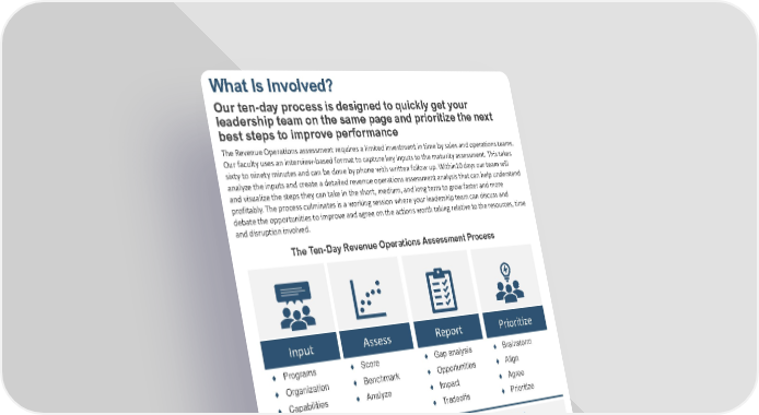 What Is Involved? The Revenue Operations assessment requires a limited investment in time by sales and operations teams. Our faculty uses an interview - based format to capture key inputs to the maturity assessment. This takes sixty to ninety minutes and can be done by phone with written follow up. Within10 days our team will analyze the inputs and create a detailed revenue operations assessment analysis that can help understand and visualize the steps they can take in the short, medium, and long term to grow faster and more profitably. The process culminates is a working session where your leadership team can discuss and debate the opportunities to improve and agree on the actions worth taking relative to the resources, time and disruption involved. Input Assess Report Prioritiz e ⧫ Programs ⧫ Organization ⧫ Capabilities ⧫ System s ⧫ Score ⧫ Benchmark ⧫ Analyz e ⧫ Gap analysis ⧫ Opportunities ⧫ Impact ⧫ Tradeoffs ⧫ Brainstorm ⧫ Align ⧫ Agree ⧫ Prioritize Our ten - day process is designed to quickly get your leadership team on the same page and prioritize the next best steps to improve performance The Ten - Day Revenue Operations Assessment Process 10 REASONS CEOS ARE PURSUING REVENUE OPERATIONS 1. Monetizing commercial data, technology and relationship assets 2. Managing selling economics 3. Differentiating the customer experience. 4. Executing scalable growth technologies. 5. Facilitating business model change 6. Improving visibility and transparency 7. Motivating and enabling team selling 8. Improving technology adoption and ROI 9. Eliminating revenue and margin leakage 10. Supporting business valuations © The Revenue Enablement Institute 2021. All rights reserved. REVENUE OPERATIONS MATURITY ASSESSMENT