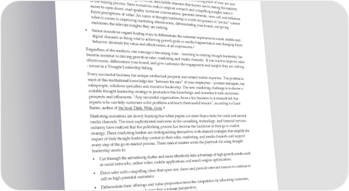 • The quality of marketing content impacts the ability of marketers to drive top line growth with digital, social, native advertising and mobile channels. For example, 61% marketing executive’s view earned media – driven by thought leadership marketing, influencer marketing, and content marketing – as a primary driver of top line growth in their company. 1 Marketing executives are learning that subject matter expertise and a strong point of view are now essential to success in the digital, social, and mobile channels that buyers use to during the majority of the buying process. Sales executives realize original research and compelling insights make it easier to open doors, start quality customer conversations, generate referrals, cross sell, and influence buyer perceptions of value. An ounce of thought leadership is worth ten pounds of “me too” content when it comes to improving marketing effectiveness, differentiating your brand, and giving customers the relevant insights they are seeking. • Senior executives regard finding ways to differentiate the customer experience in social, mobile and digital channels as being vital to achieving growth goals as media fragmentation and changing buyer behavior diminish the value and effectiveness of ad impressions.3 Regardless of the medium, one message is becoming clear – investing in creating thought leadership has become essential to driving growth in sales, marketing and media channels. If you want to improve sales effectiveness, differentiate your brand, and give customers the engagement and insights they are seeking - invest in a Thought Leadership Selling. Every successful business has unique intellectual property and subject matter expertise. The problem is most of this institutional knowledge lies “between the ears” of your employees – product managers, top salespeople, solutions specialists and executive leadership. The new marketing challenge is to devise a scalable thought leadership strategy to productize this knowledge, and monetize it with customers, prospects and influencers. “Any successful organization, from a tire business to a research lab, has experts who can help customers solve problems and teach them useful lessons”, according to Grant 4 Butler, author of the book Think, Write, Grow. Marketing executives are slowly learning that white papers are more than a tactic for social and earned media channels. The most sophisticated marketers in the consulting, technology, and financial services industry have realized that the publishing process has become the backbone of their go to market strategy. These marketing leaders are distinguishing themselves with channel strategies that amplify the impact of their thought leadership content in their sales, marketing, and media channels and support every step of the go-to-market process. These market leaders wrote the playbook for using thought leadership assets to: • Cut through the advertising clutter and more effectively take advantage of high growth media such as social networks, online video, mobile applications and search engine optimization; • Drive sales with compelling ideas that open new doors and provide relevant reasons to continue to call on high potential customers; • Differentiate their offerings and value proposition from the competition by educating customers, delivering good ideas, and providing a unique perspective; • Demonstrate that they understand the needs, preferences and behaviors of their top customers; • Increase ROI by better leveraging their marketing content in the go-to-market process; • Make it easier for content to be consumed in media, marketing and sales channels. Thought Leadership Selling Page 4 © Revenue Enablement Institute 2022