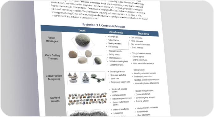 promoting their brand message in advertisements at the front of the sales funnel. Product organizations are prolific at creating collateral about product benefits at the end of the funnel, but not customer value. The trick is to create “connective tissue” – such as sales playbooks, marketing automation templates, and conversation templates - to drive that value messages and selling themes deeper into the customer buying cycle and support day-to-day value conversations. According to Tim Riesterer, Chief Strategy Officer of Corporate Visions “The core ‘connective tissue’ that maps messages and themes to tactical content assets are conversation templates – which are frameworks for packaging content to support highly relevant sales conversations. Conversation templates like these help marketers execute modern sales and marketing program. They help enable targeting and personalization at the point of sale, leverage Marketing Cloud software, support sales enablement programs and establish a basis for channel measurement and behavioral based incentives.” Illustration of A Content Architecture Thought Leadership Selling Page 10 © Revenue Enablement Institute 2022