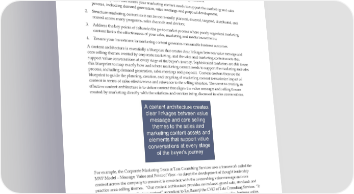 Developing a Content Architecture The second element of a Thought Leadership Strategy is a Content Architecture. A Content Architecture is an analysis that helps you assess how well your existing marketing content, promotions, collateral and other sales resources are supporting your salespeople and enabling a quality customer experience. The table below illustrates how a content architecture can help your organization: 1. Map exactly how and where your marketing content needs to support the marketing and sales process, including demand generation, sales meetings and proposal development; 2. Structure marketing content so it can be more easily planned, sourced, targeted, distributed, and reused across many programs, sales channels and devices; 3. Address the key points of failure in the go-to-market process where poorly organized marketing content limits the effectiveness of your sales, marketing and media investments; 4. Ensure your investment in marketing content generates measurable business outcomes. A content architecture is essentially a blueprint that creates clear linkages between value message and core selling themes created by corporate marketing, and the sales and marketing content assets that support value conversations at every stage of the buyer’s journey. Sophisticated marketers are able to use this blueprint to map exactly how and where marketing content needs to support the marketing and sales process, including demand generation, sales meetings and proposal. Content creators then use the blueprint to guide the planning, creation, and targeting of marketing content to maximize impact of content in terms of sales effectiveness and relevance to the selling situation. The secret to creating an effective content architecture is to define content that aligns the value messages and selling themes created by marketing directly with the solutions and services being discussed in sales conversations. A content architecture creates clear linkages between value message and core selling themes to the sales and marketing content assets and elements that support value conversations at every stage of the buyer’s journey For example, the Corporate Marketing Team at Tata Consulting Services uses a framework called the MVP Model – Message, Value and Point of View - to direct the development of thought leadership content across the company to ensure it is consistent with the overarching value message and core practice area selling themes. “Our content architecture provides swim lanes, guard rails, standards and guidelines for writing effective content” according to Raj Banerji the CMO of Tata Consulting Services. “It gives content producers within our practice areas horizontal themes that cut across silos, business unites, marketing programs and geographies.” The secret to creating an effective content architecture is to define content that aligns the value messages and selling themes created by marketing directly with the solutions and services being discussed in sales conversations. Few organizations do this well. Marketers generally do a good job defining and Thought Leadership Selling Page 9 © Revenue Enablement Institute 2022
