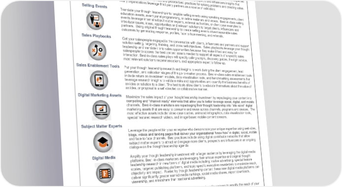 Elements of a Thought Leadership Program Original Research Demonstrate the depth and quality of your unique insights, ideas and solutions with advisory publications such as research reports, white papers, or eBooks. The most effective marketers create advisory publications are based on original primary research with peer executives, respected influencers, and subject matter experts that offer clients, prospects and influencers insights that validate risks and opportunities and provide best practices for solving problems and creating value. Many organizations leverage third party partners as a source of validation. Selling Events Translate your thought leadership into tangible selling events using speaking engagements, client education events, event panel programming, or online webinars and videos. Best-in-class selling events leverage internal subject matter experts, external authorities, or client case examples to introduce issues, ideas, opportunities and relevant solutions to target clients, influencers and partners. Using original thought leadership to create selling events drive measurable sales outcomes by generating response, profiles, face to face meeting, and referrals. Sales Playbooks Get your salespeople engaged in the conversation with clients, influencers and partners and support solution selling, targeting, training, and cross sell objectives. Sales playbooks leverage your thought leadership and translate it into sales opportunities because they make if fast and easy for salespeople to access the best content assets needed to support all aspects of a specific sales interaction. Best-in-class sales plays will specify calling scripts, discovery guides, the right advice, most relevant solutions recommendations, and appropriate expert to follow-up. Sales Enablement Tools Put your thought leadership research and insights to work during the client engagement, lead generation, and validation stages of the go-to-market process. Best-in-class sales enablement tools include return on investment models, data visualization tools, and benchmarking assessments that leverage research insights to validate risks and opportunities and quantify the business benefits of an idea or solution to a client. The best tools allow clients to educate themselves about the value of an idea, or proposal in a self-directed or collaborative manner. Digital Marketing Assets Maximize the sales impact of your thought leadership investment by repackaging your content into compelling and “channel ready” elements that allow you to better leverage social, digital, and mobile channels. Best-in-class marketers are repackaging their thought leadership into “bite sized” digital marketing assets that are easy to consume and reuse across channels, programs and devices. The most effective assets include: video case studies, animated infographics, data visualization tools, special featured research videos, and image based mobile content streams. Subject Matter Experts Leverage the people within your enterprise who demonstrate your unique expertise using web sites, blogs, videos and landing pages that deliver your organizational “know how” in digital, social, mobile and face-to-face channels. Best practices include using digital contributor networks that allow subject matter experts to attract and engage more clients, prospects and influencers in an ongoing dialogue on the thought leadership agenda Digital Media Amplify your thought leadership investment with a larger audience by leveraging the digital media platforms. Best -in-class marketers are leveraging their unique expertise and original thought leadership research in new forms of digital media including: native advertising, special feature stories, targeted publishing platforms, and topic specific executive newsletters to maximize reach, objectivity and impact. Fueled by thought leadership content these new digital media platforms can deliver significantly greater earned media rankings, social media shares, report downloads, viewership, and mindshare than traditional advertising. Social Media Help your marketing team, salespeople, resellers, and media partners to amplify the reach of your ideas and insights by delivering your thought leadership assets using top social networks including Twitter, Linked-in as well as client sales, marketing. Best practices include leveraging partners that can provide objectivity and leverage using subject matter expert accounts to broadcast your message and expand your organic search engine rankings and reach. Thought Leadership Selling Page 14 © Revenue Enablement Institute 2022